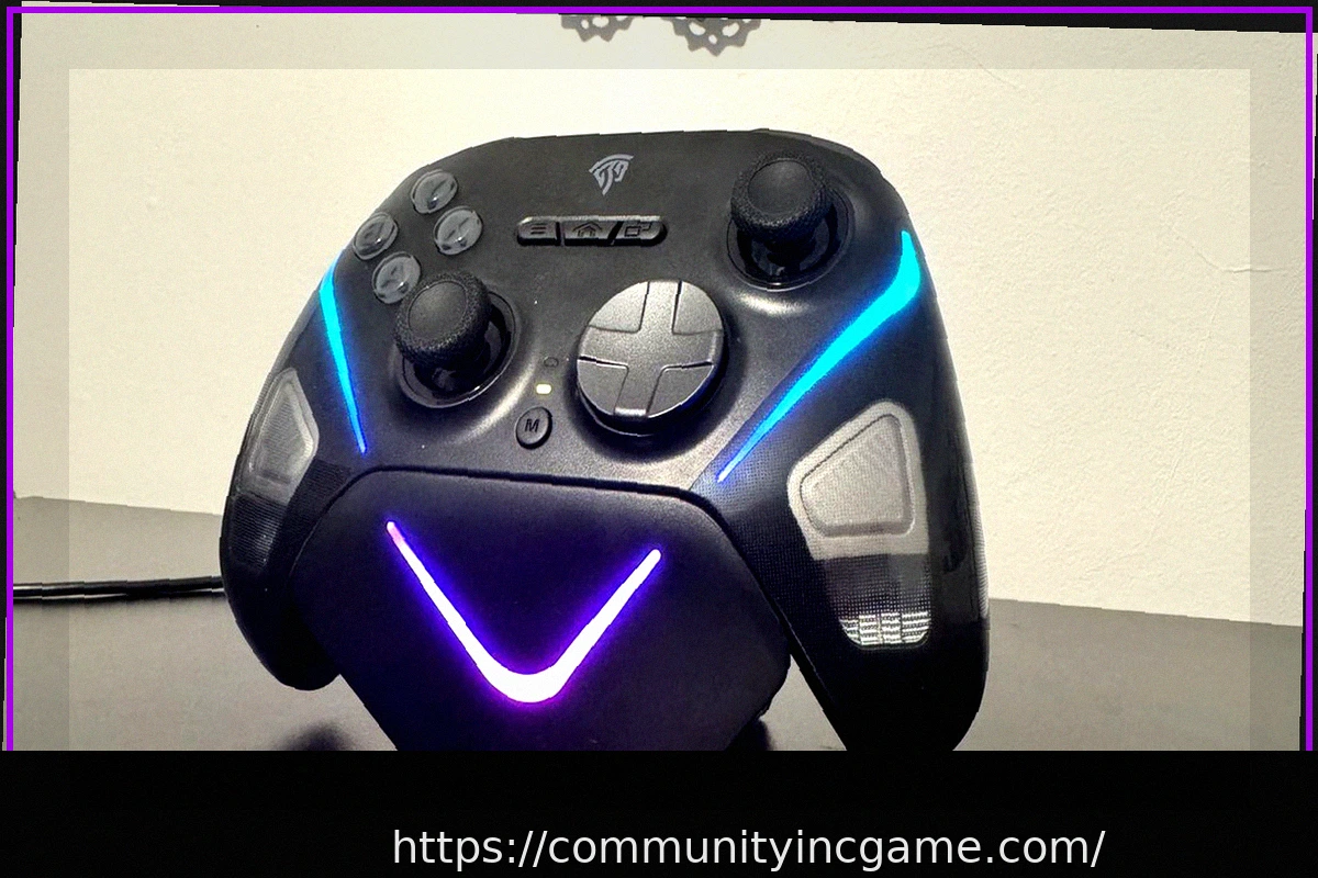 The EasySMX D10 gaming controller is prominently displayed on its illuminated charging stand, resting elegantly on a sleek black desk. This initial visual sets the stage for a comprehensive review, highlighting the device’s design and its convenient charging solution.