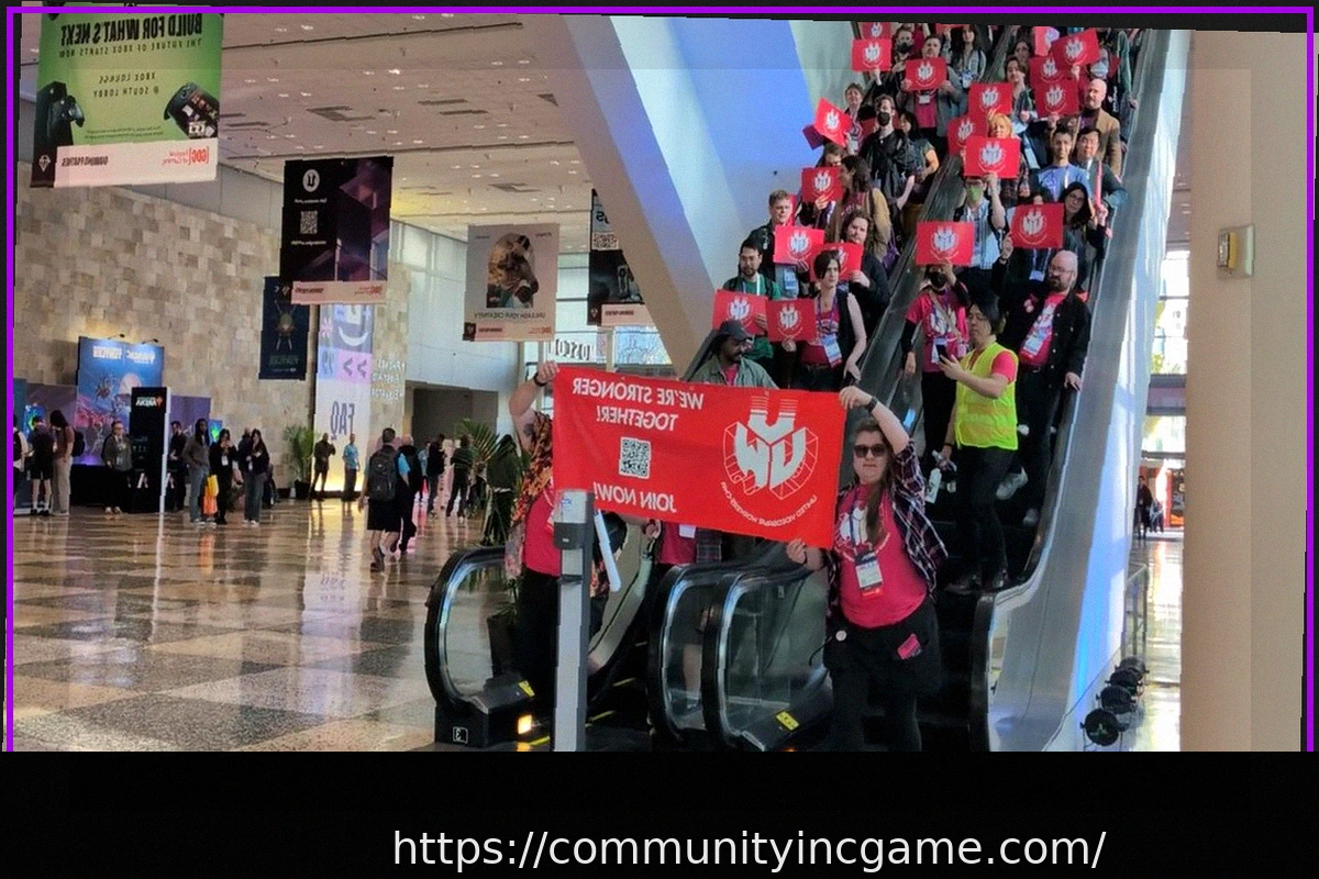 Members of the Game Workers United-CWA union made a prominent appearance at GDC 2026. As they descended an escalator, they displayed striking red banners emblazoned with the unifying slogan, ‘We’re stronger together,’ signaling their collective spirit and advocacy for improved conditions in the game development industry.