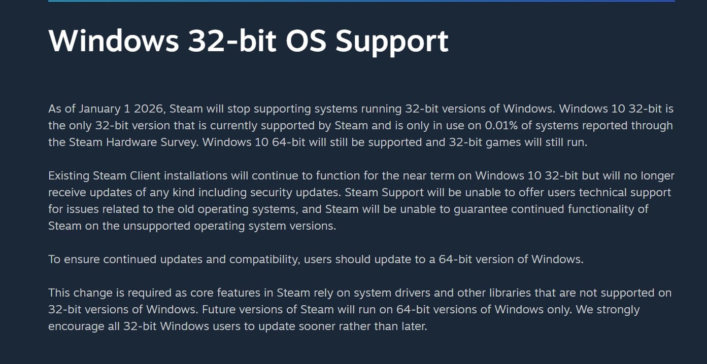 Valve notes that the impact is expected to be minimal, as 32-bit Windows 10 is currently used on only 0.01% of systems, according to their Steam Hardware Survey. Although the Steam client itself is presently a 32-bit application across all Windows versions, the company confirms that future iterations will be developed to run exclusively on 64-bit operating systems.