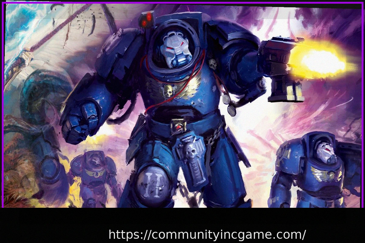 An illustration depicts a squad of Space Marine Terminators unleashing fire from their storm bolters.