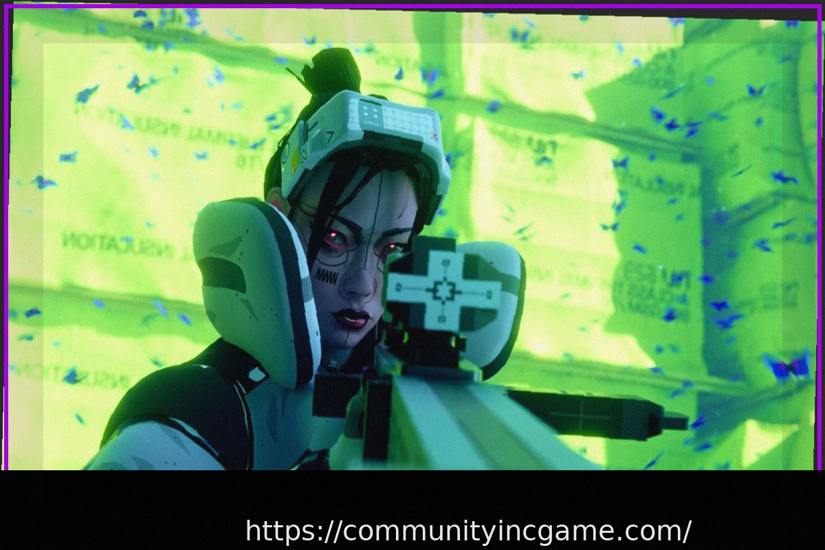 The ‘Thief’ shell from Marathon is prominently featured, aiming a sniper rifle directly forward. Behind it, a vibrant green tarpaulin wall creates a striking background.
